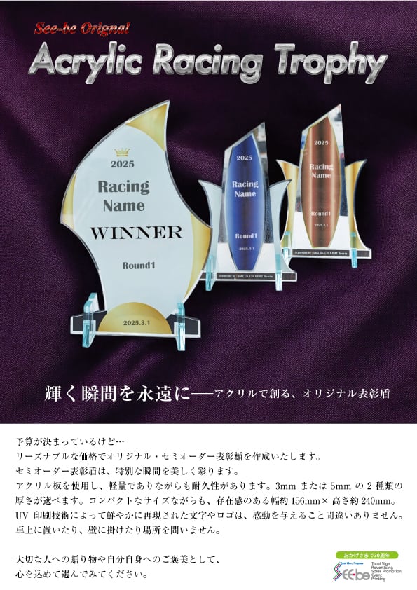 アクリル板を使用し、軽量でありながらも耐久性があります。3mmまたは5mmの2種類の厚さが選べます。コンパクトなサイズながらも、存在感のある幅約156mm×高さ約240mm。